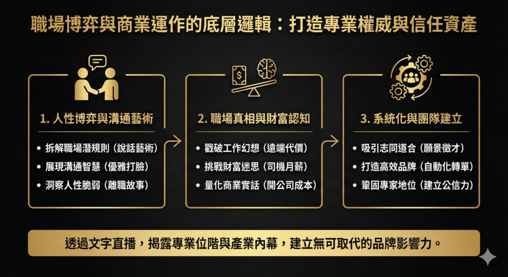 紀錄職場中的真實博弈與商務運作的底層邏輯,能快速吸引上班族的強烈共鳴。透過文字直播揭露專業位階與產業內幕,能建立起無可取代的公信力與品牌權威。